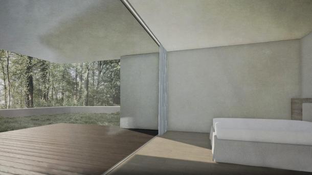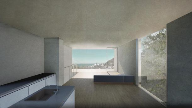 横須賀市秋谷で進めている、全4戸の集合住宅の計画。接道からのアプローチ外観と開口(外部)を取り込んだインテリア(案)のパースを作成しました。