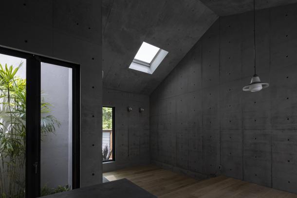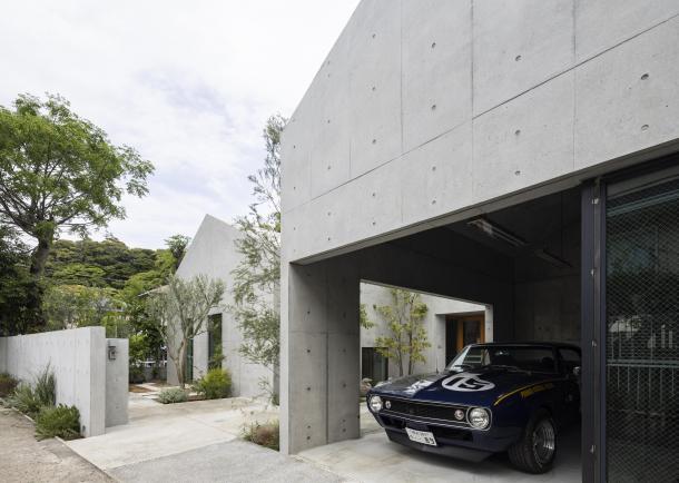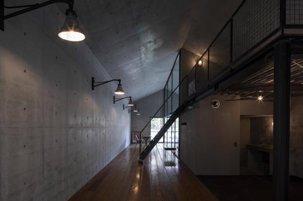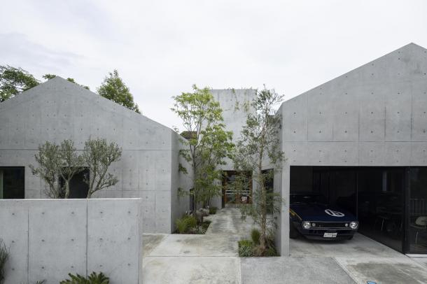 Hail Mary Magazine 編集長の自宅兼仕事場兼ギャラリー兼ジム兼ガレージである。RC の平屋をベースに、一部ロフト(申請上は 2 階)スペースを設け、基本構成としては大きく 3 つの棟に分かれていて、中央がエントランスギャラリー でその両側に家型のボリュームが接続されている。家族構成は編集長と奥様、娘様それと犬一匹。