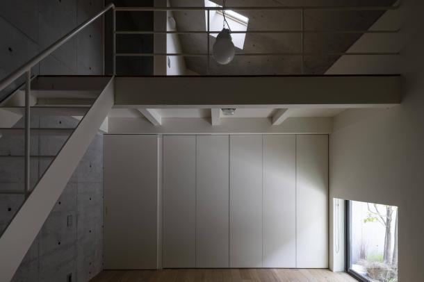 住宅地の交差点に建つ戸建住宅。コンパクトな敷地の中で階段室の吹き抜けを利用して、地面か...