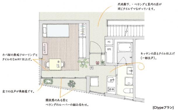 共用部の床仕上げは玄関を介して各住戸のテラスと繋がり、テラス・室内・共用部の関係が流動的になることで風の通り道が生まれ、テラスや共用部が生活に取り込まれた豊かな日常を演出してくれるはずです。