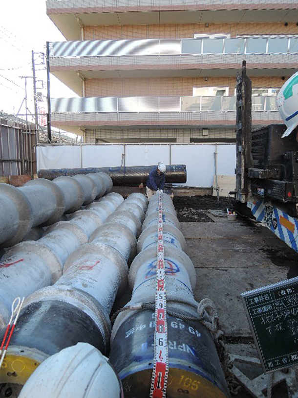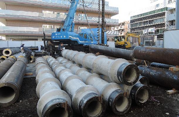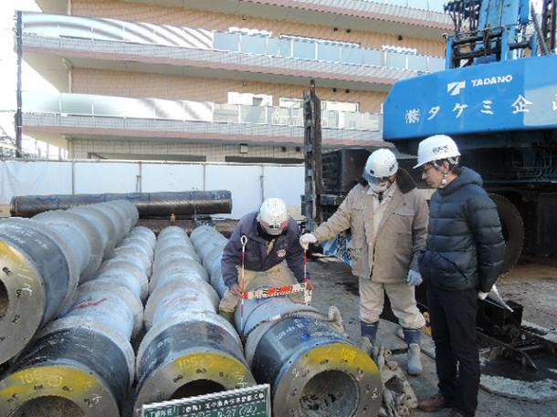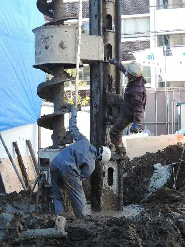 プレボーリング拡大根固め工法に分類される工法です。長年にわたる豊富な経験・実績から開発された工法で、従来の工法よりも大きな支持力が得られる、高支持力杭工法で建物を支えます。長さや径の確認をし、試験杭を行い確認をしました。