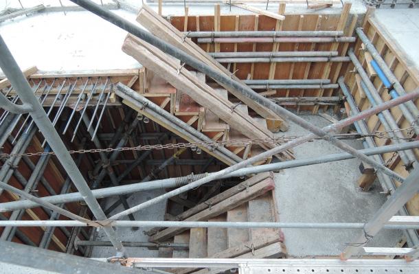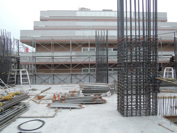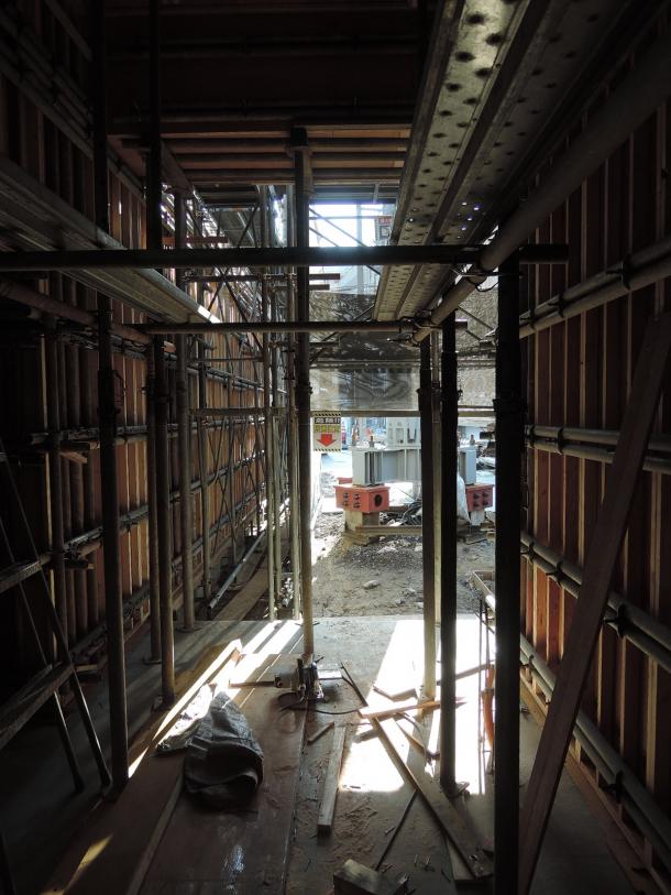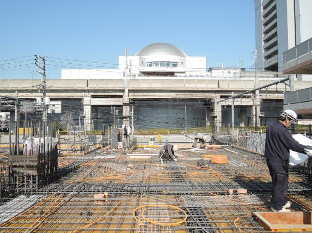 順調に躯体工事が進んでいます。形が見えはじめ、空間としても感じられるようになりました。エントランスのある1Fの天井は高く、大らかな空間となりそうです。