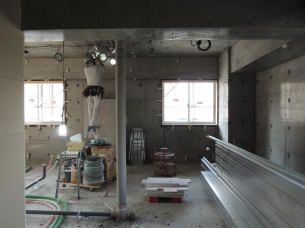 サッシが取り付き、内装工事が順調に進んでいます。部屋の構成、光の入り方など設計意図どおりに出来ていると思います。