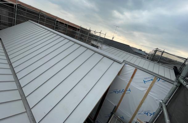 ガルバリウム縦ハゼ葺きは職人さんが板金を1枚ずつ曲げてかみあわせて作る屋根です。