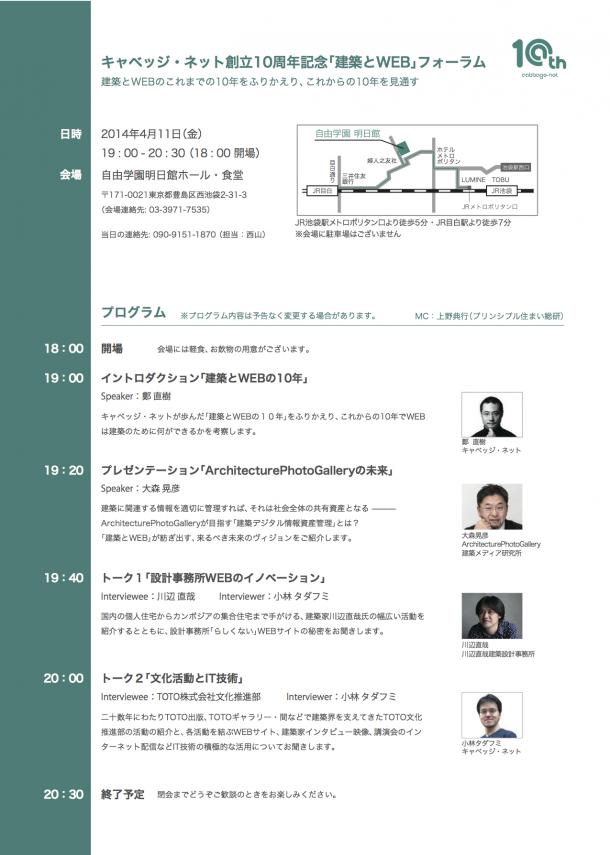 「Platform」を一緒に作っていただいた、キャベッジネットさんの創立10周年記念「建築とWEB」フォーラムにて、「設計事務所WEBのイノベーション」と題して、代表の小林タダフミさんと話をします。