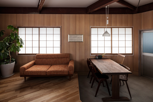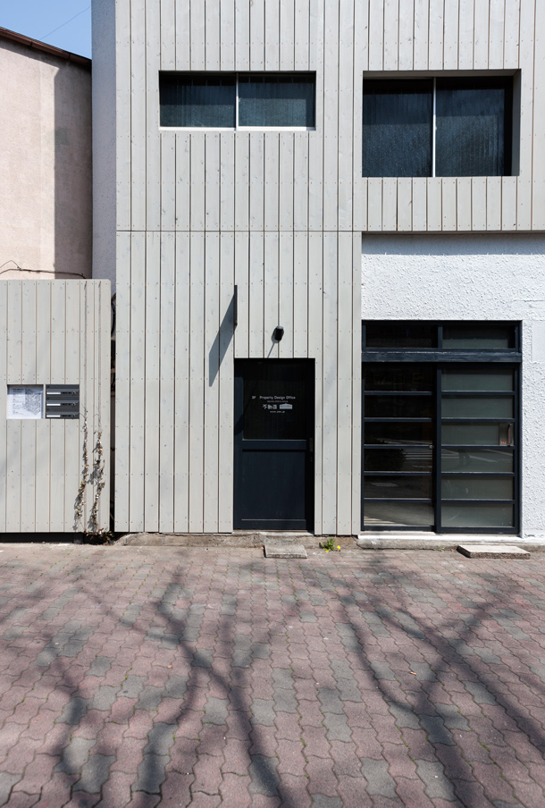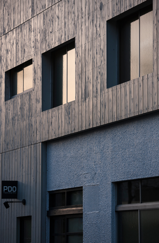 外装には、既存外壁の保護を兼ねた塗装と、杉板をマスクのように貼ることで、佇まいは継承しながら、新たな表情をつくっています。