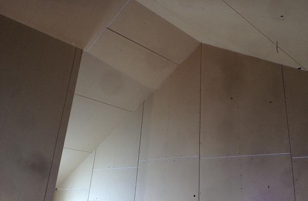 天井の下地材が貼られ、屋根の形状が分かるようになってきました。