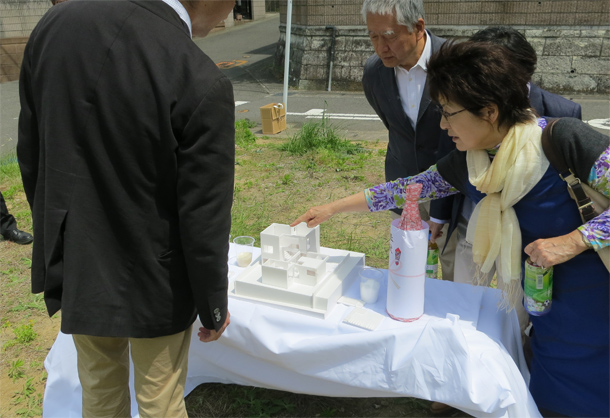 天候にも恵まれ、青空のもと、簡易ながら地鎮祭を行い、模型や地縄(建物の位置を示すため外形に沿って張られる縄)を確認しました。 この記事にコメントする