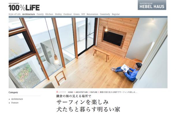 「鎌倉極楽寺の住宅」が100%LiFE…スタイルのある家と暮らし、というウェブサイトに掲載されました。「サーフィンを楽しみ犬たちと暮らす明るい家」というタイトルです。