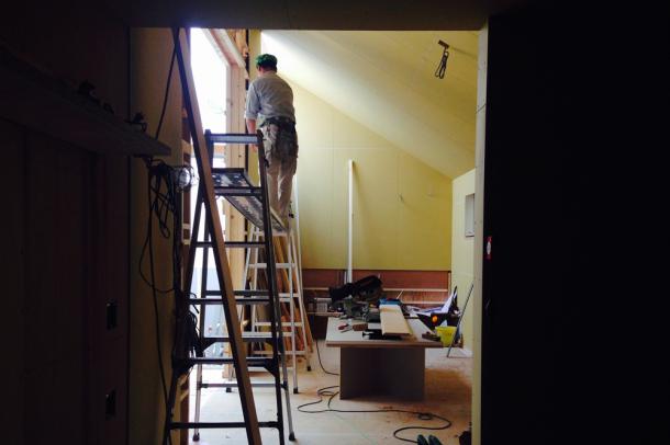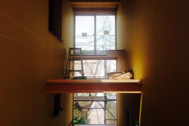枠廻りが取り付き、ボードが貼られ、室内の骨格が徐々にかたちになってきました。