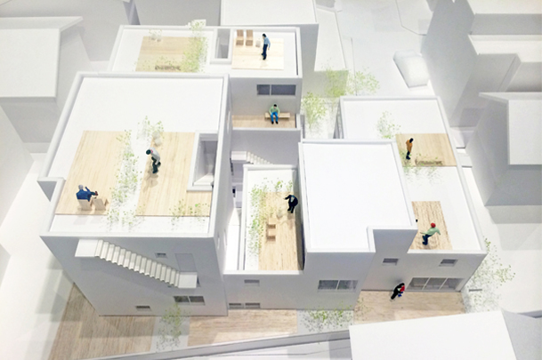 新宿区に建つ6世帯のコーポラティブハウス。接続している道路からアプローチの階段を下りると、周囲から...