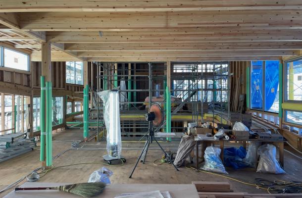 進捗としては、木造軸組にサッシが設置され、室内と外のつながりの様子がわかります。