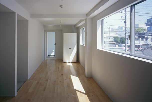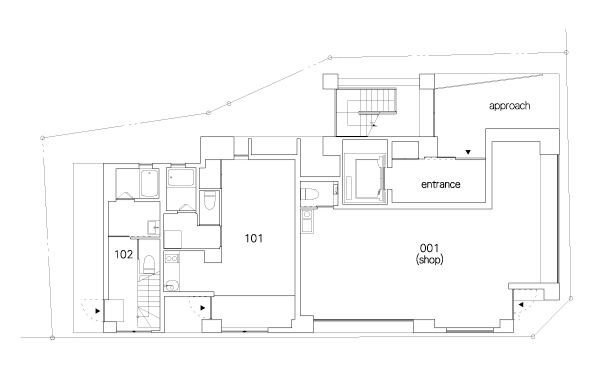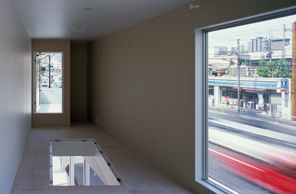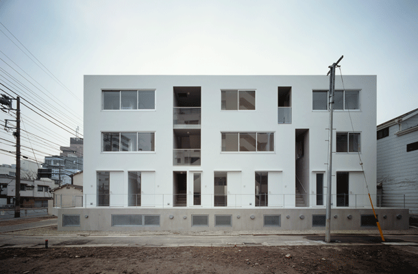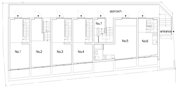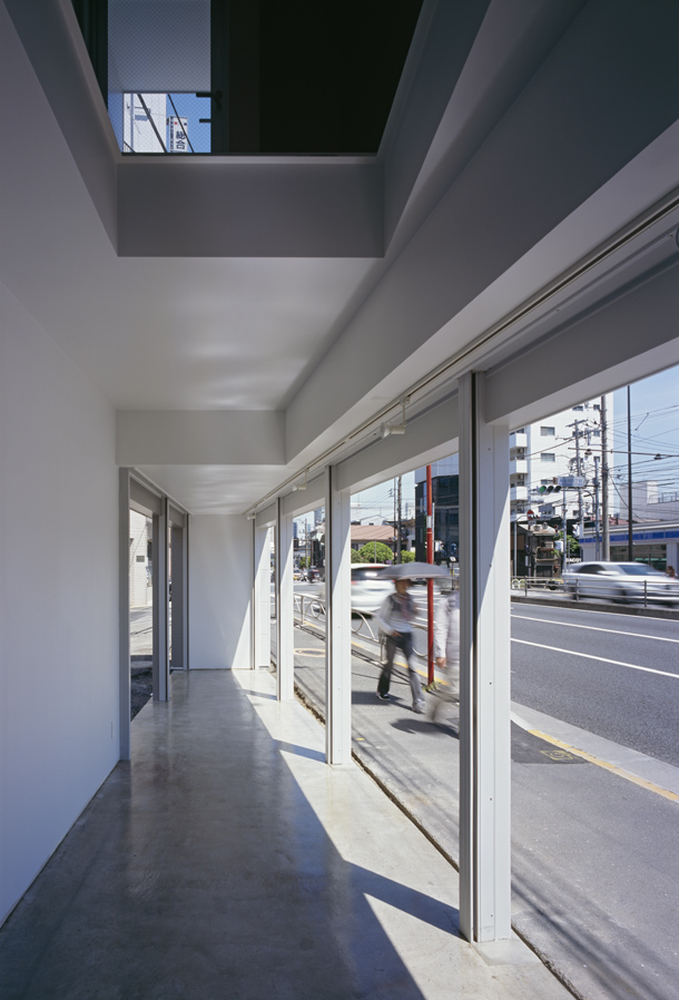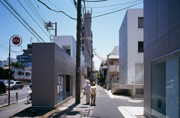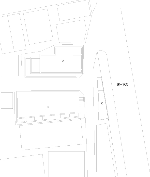 T字道路によって分けられた3つの敷地に建つ建築群である。それぞれの敷地は接道条件と用途地域が異なり、事業収支を考慮した建物規模には大きな差が現れ、大きい順にA(鉄骨造),B(鉄筋コンクリート造),C(木造)計画としている。住宅のスケールと国道沿いの大きなスケールが切り替わる場所で、それらを繋げていくような建築を目指した。できる限りシンプルな形態を採用しながら、道路をひとつの床として捉え各建築の床レベルをずらす、立面をひな壇状にセットバックさせるといった操作により、生活者と公共の場との調停を図っている。建築を道路をも含んだ街としてとらえ、生活とデザインが一体となった形態を導き出している。