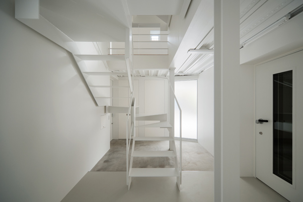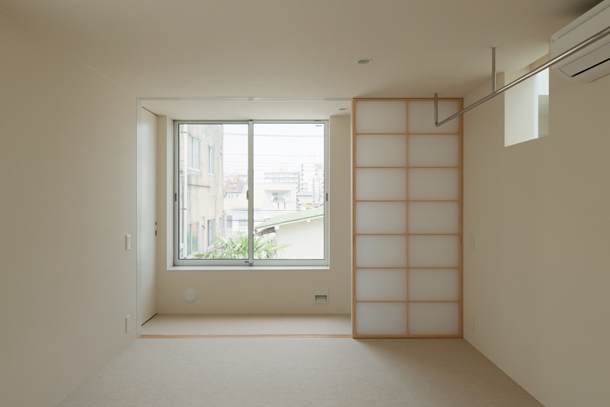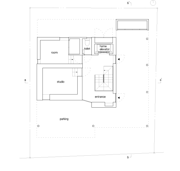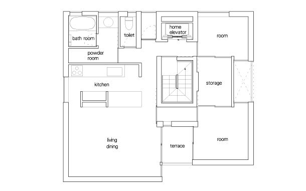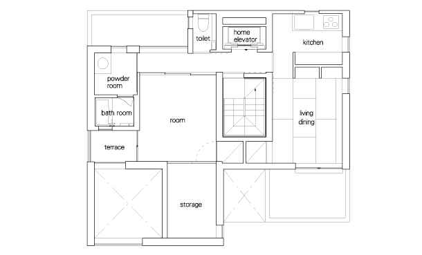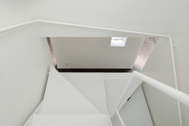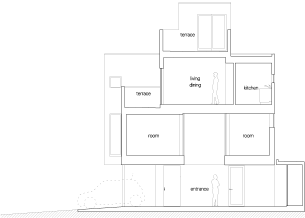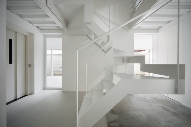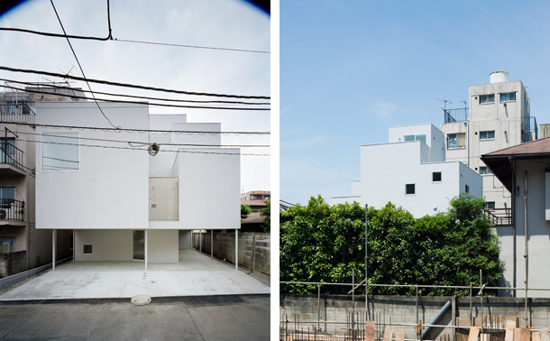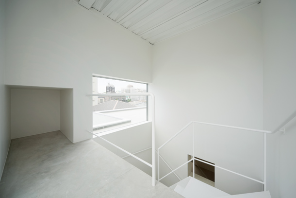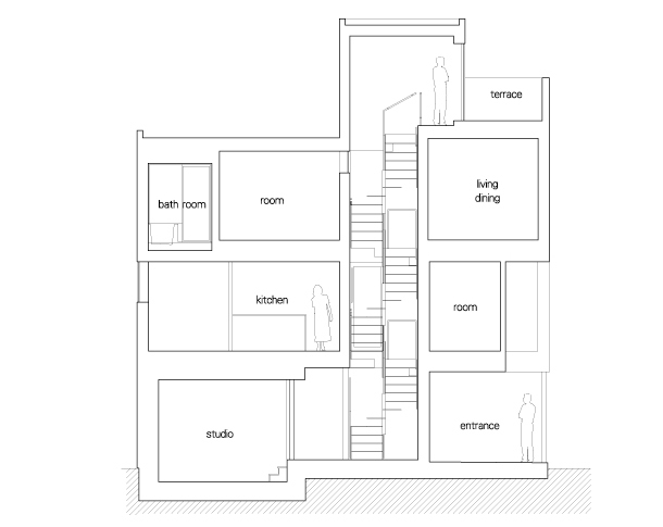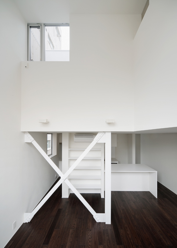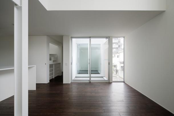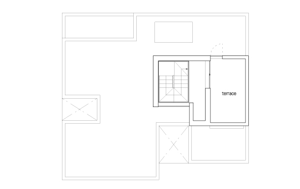 周辺が立て込んだ住宅地に建つ3階建ての二世帯住宅。道路斜線と北側斜線の稜線に納まる、凸凹した山のような形となっている。周囲に開けた視界が確保できない為、外形を凸凹させて吹き抜けやテラスを設け、外部からのプライバシーを遮りつつ、二世帯の距離感も保っている。小さく分割された外壁面は周囲への圧迫感を減らす役割も持っている。開口部の少ない山のような印象をつくりながらも、内部は一日を通して明るい光が巡る。中央には1階からペントハウスまでまっすぐに伸びる階段が貫いており、家族間の気配や陽の光、夏場の暖気を抜く風の通り道となっている。諸室が多い二世帯で、室の数と同じくらいの外部環境を用意しながら、ひとつの家として仕立てている。