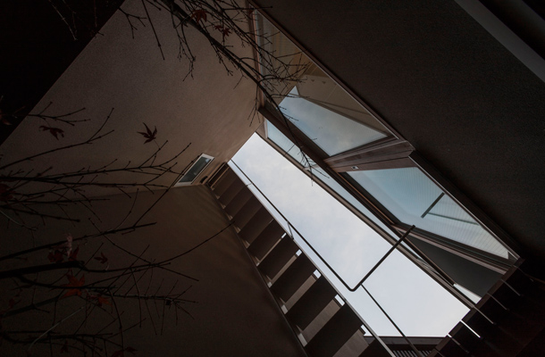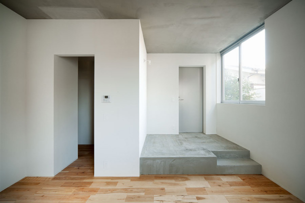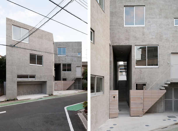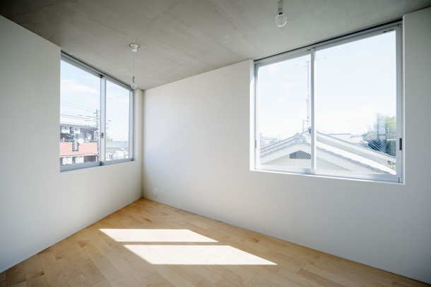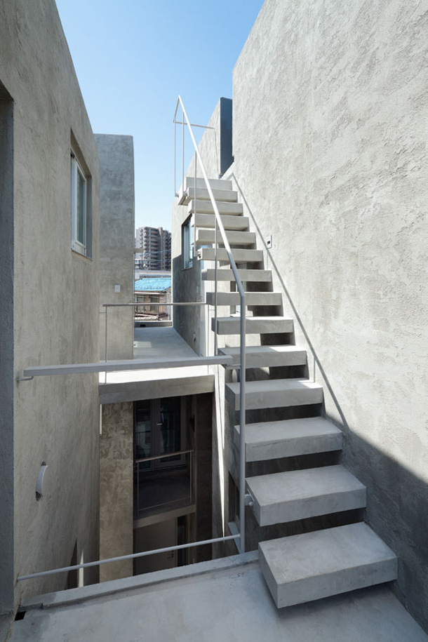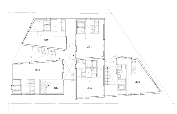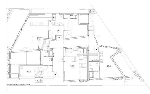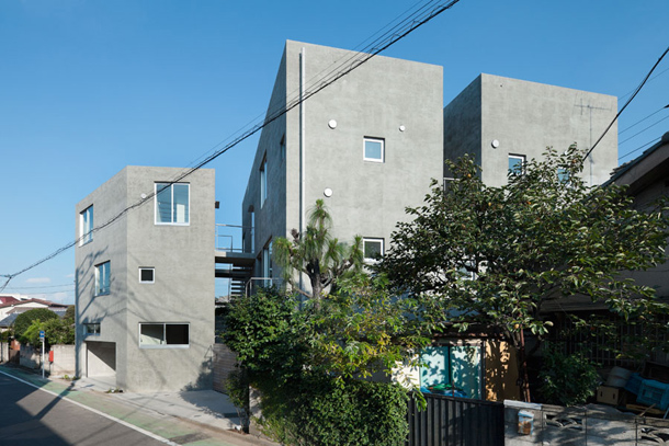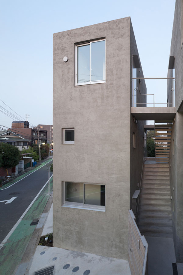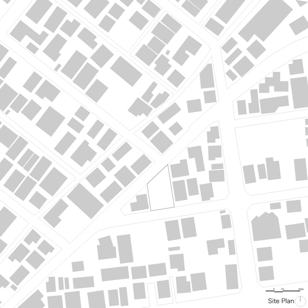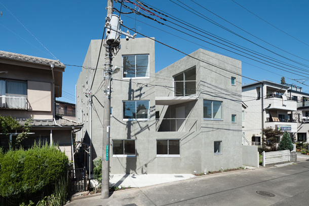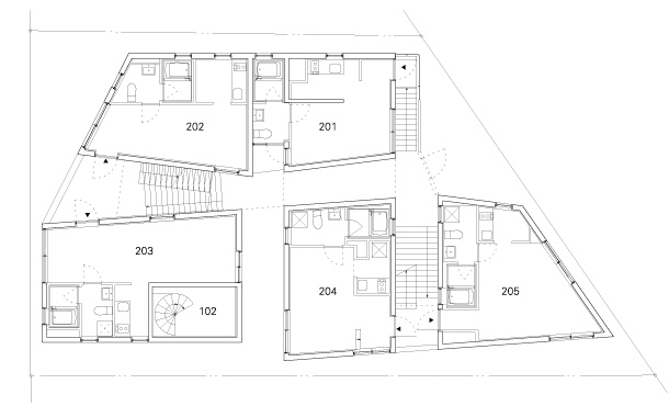 2面道路に接している敷地の特性と周辺環境が持つ抜けをいかに共用部に引き込んで住戸環境と通路としての質に結びつけるかを考えた。要望された条件として、25〜30平米の1R形式でありながらさまざまなプランを持つ部屋13戸、80平米ほどのファミリーに対応出来る部屋1戸、全14戸の構成となっている。周辺環境を共用部に引き込み5つのヴォリュームに分節することにより、住戸は独立性の高い平面を持つ。隣接する戸建住宅の空地を取り込み、隣家の高さ関係を考慮しながら視線を空に導くなど外部環境の関わり方や視線の制御を考慮しながら共用部、開口部が配置されている。対面する壁面に少しずつ角度をつける事で住戸同士の関係の制御し、谷となった共用部に風が抜ける。風は上下階を通じて抜けていき、一日を通して陽の移り変わりを感じる事ができる。共用部は環境と生活が結びついた豊かな場所となる。 この記事にコメントする