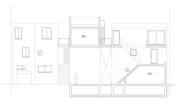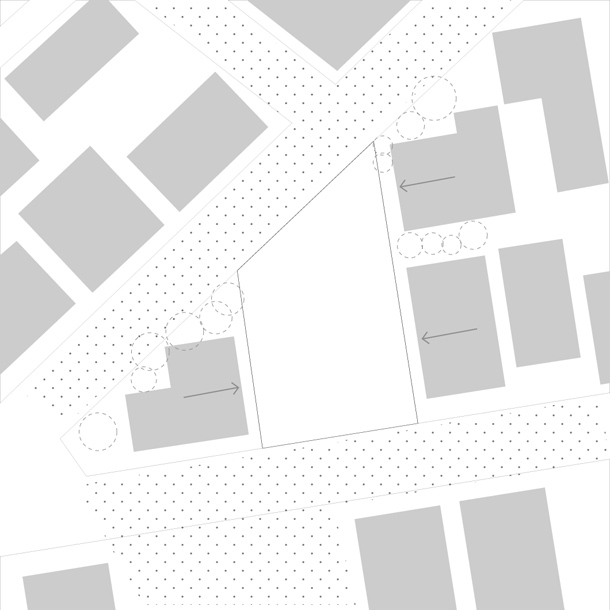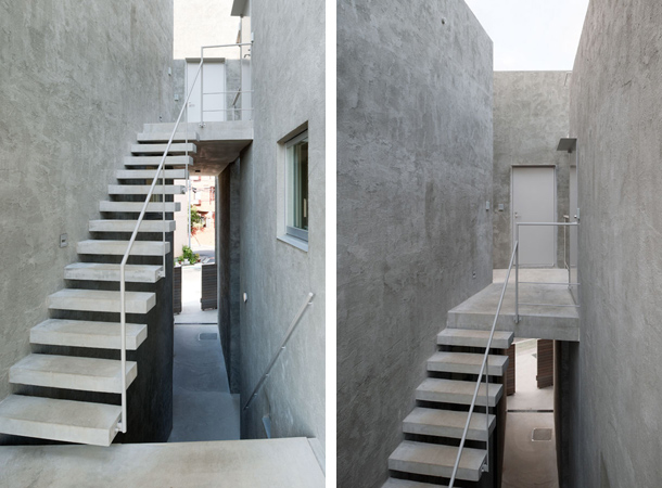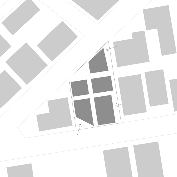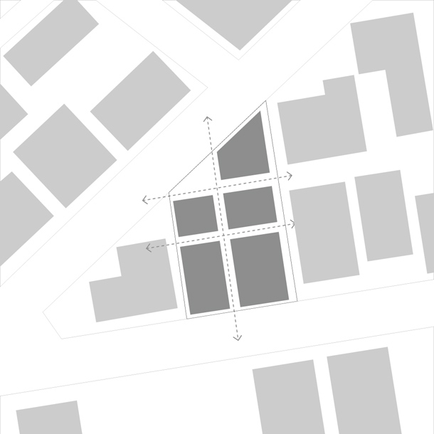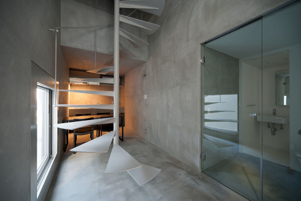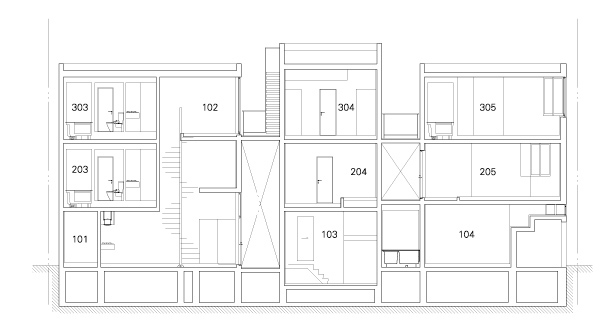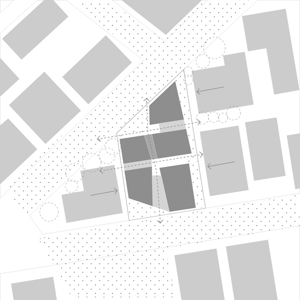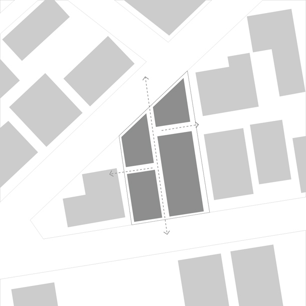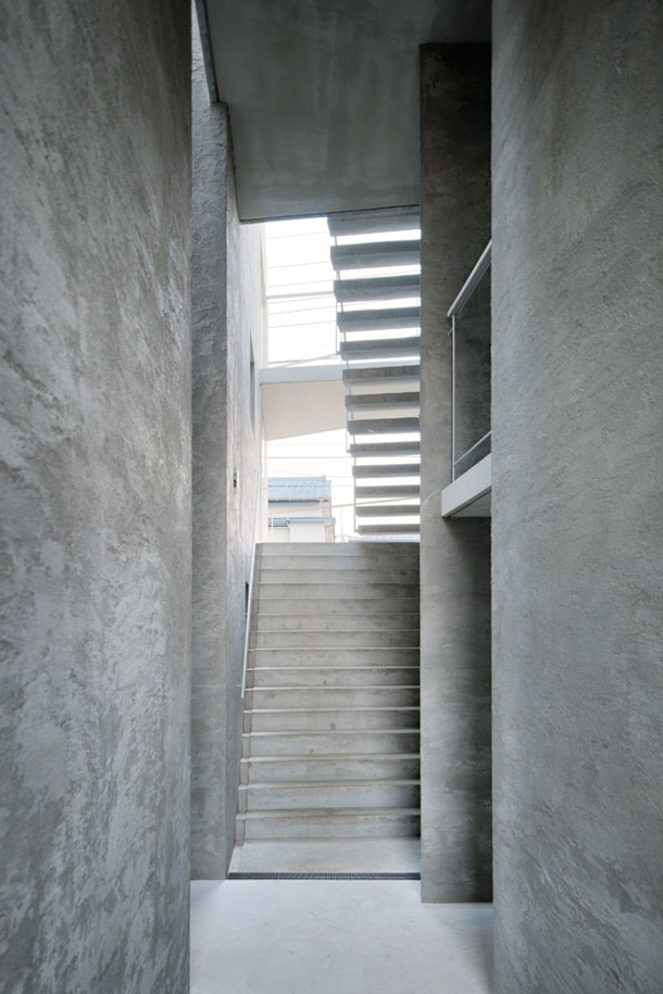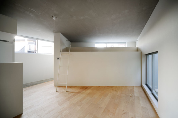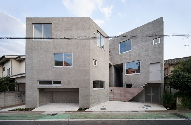 2面道路に接している敷地の特性と周辺環境が持つ抜けをいかに共用部に引き込んで住戸環境と通路としての質に結びつけるかを考えた。要望された条件として、25〜30平米の1R形式でありながらさまざまなプランを持つ部屋13戸、80平米ほどのファミリーに対応出来る部屋1戸、全14戸の構成となっている。周辺環境を共用部に引き込み5つのヴォリュームに分節することにより、住戸は独立性の高い平面を持つ。隣接する戸建住宅の空地を取り込み、隣家の高さ関係を考慮しながら視線を空に導くなど外部環境の関わり方や視線の制御を考慮しながら共用部、開口部が配置されている。対面する壁面に少しずつ角度をつける事で住戸同士の関係の制御し、谷となった共用部に風が抜ける。風は上下階を通じて抜けていき、一日を通して陽の移り変わりを感じる事ができる。共用部は環境と生活が結びついた豊かな場所となる。 この記事にコメントする