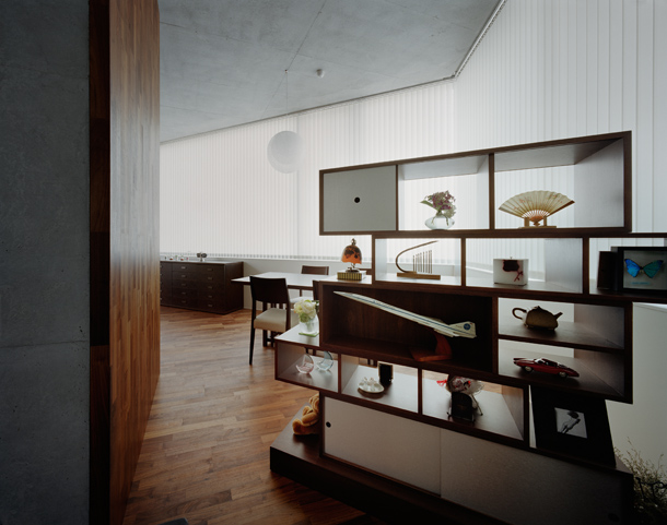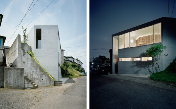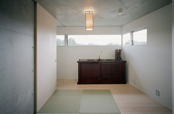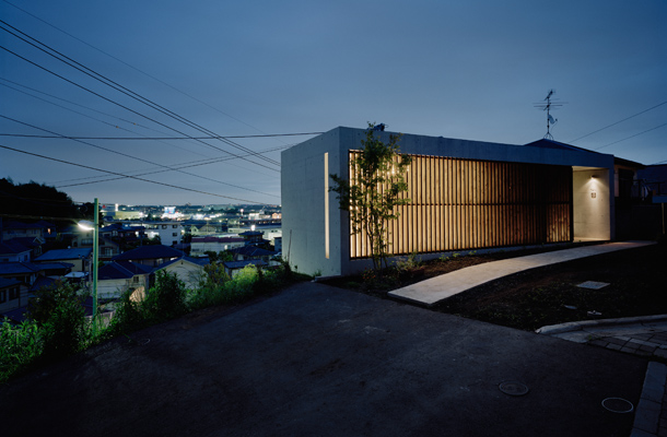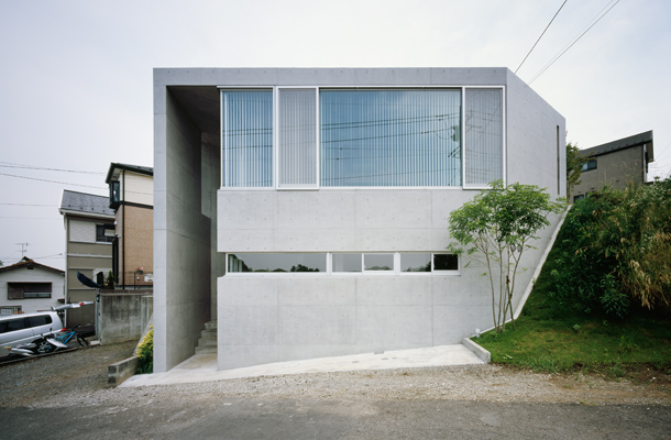 敷地上部から見ると軒の低い平屋のように見え、下の道路から見ると背の高い2層の建物に見える。敷地と周囲との関わり方やその状況の変化は大きくそして連続的で、その斜面の多様さこそがこの建築の表情をつくりだしているのである。