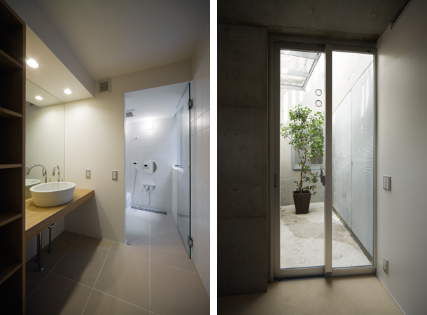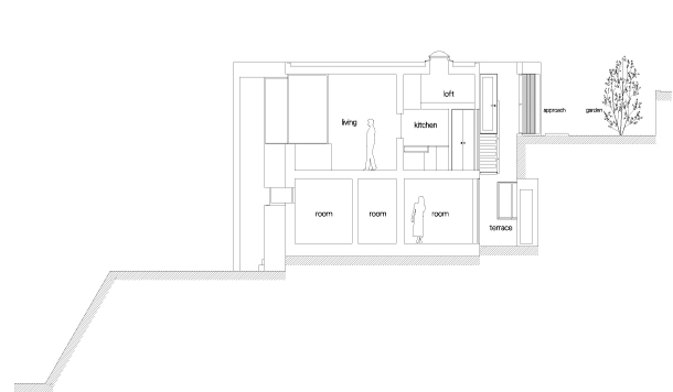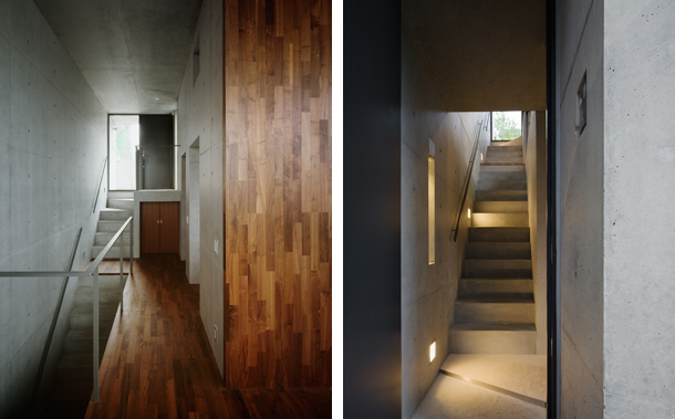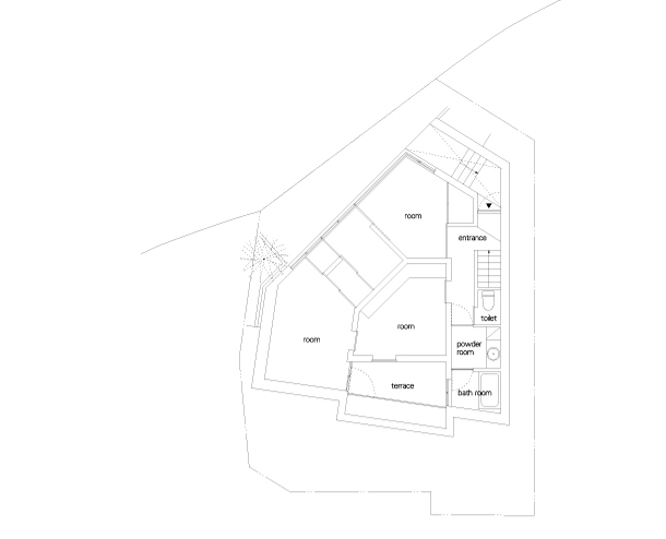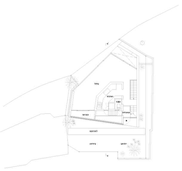 高低差の最も大きい場所に上下を繋ぐ動線をつくり、その途中に性格の異なる二つのフロアを設けている。上下階それぞれが地面と接続されているので、生活のスタイルや状況に応じてアプローチを使い分けることが可能である。