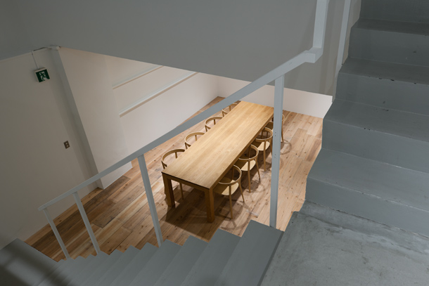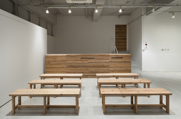 白い壁面に対して対比的に足場素材を使用することで、均質になりがちな展示空間が、背景でありながら、場としての存在感をつくり出している。 この記事にコメントする