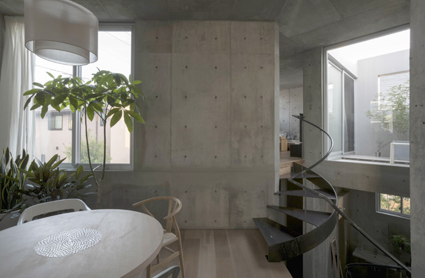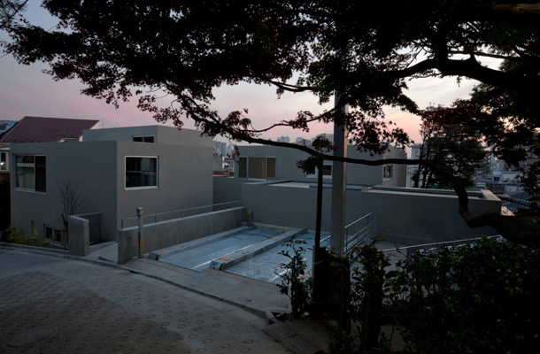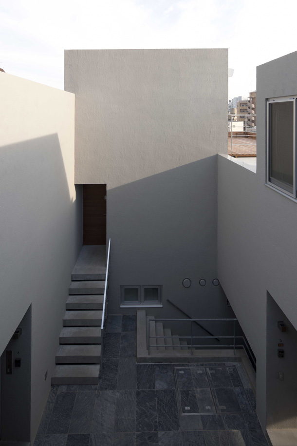 新宿区に建つ6世帯のコーポラティブハウス。接続している道路からアプローチの階段を下りると、周囲から緩やかに切り離された、中庭のような場所が現れる。そこでは各住戸のエントランスを見渡すことがえでき、見上げると建物の外形に縁取られた空が目に入ってくる。遠く副都心を眺める住戸、接続道路に面して街並みに参加する住戸、地面との距離が近く緑や土を近くに感じることのできる住戸。