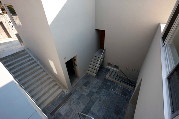前面道路から一段下りた中庭へのアプローチ