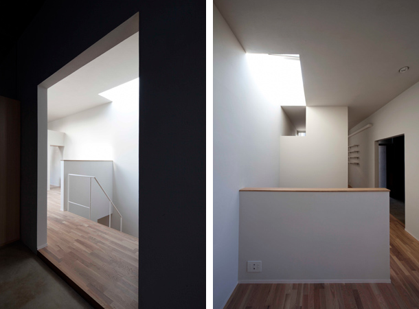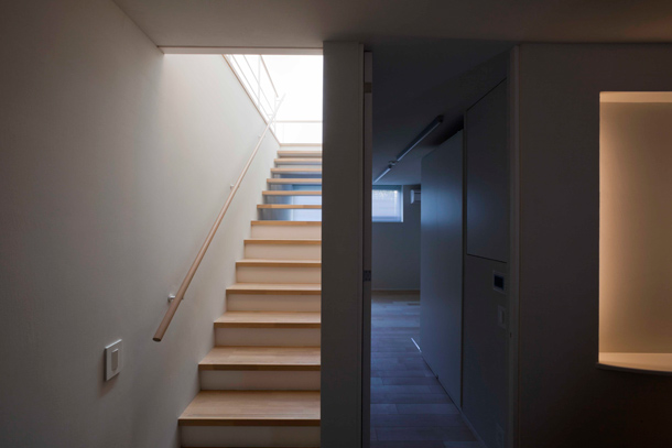 トップライトからの光が、蹴上板のない階段を介して下階まで落ちる。