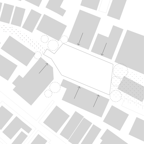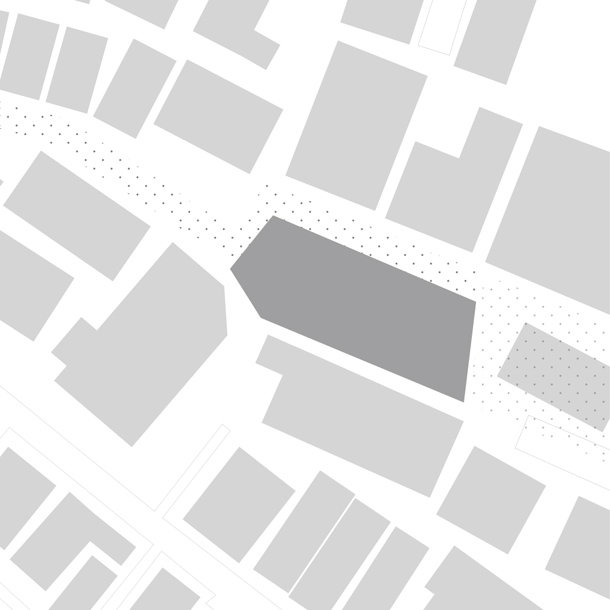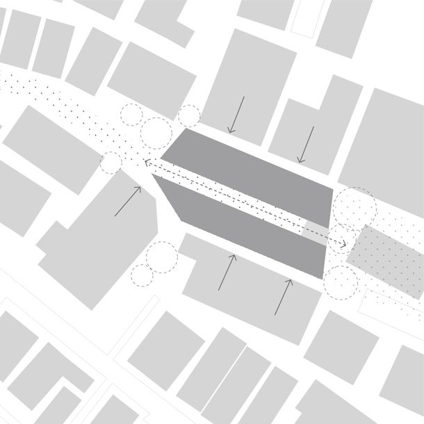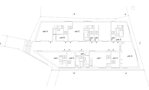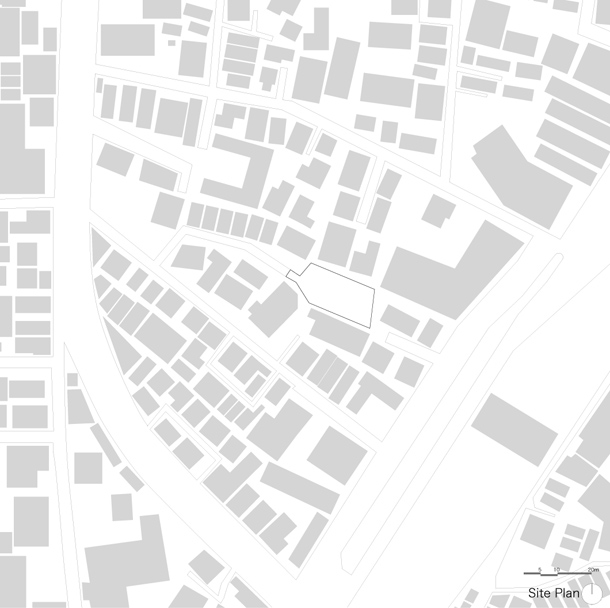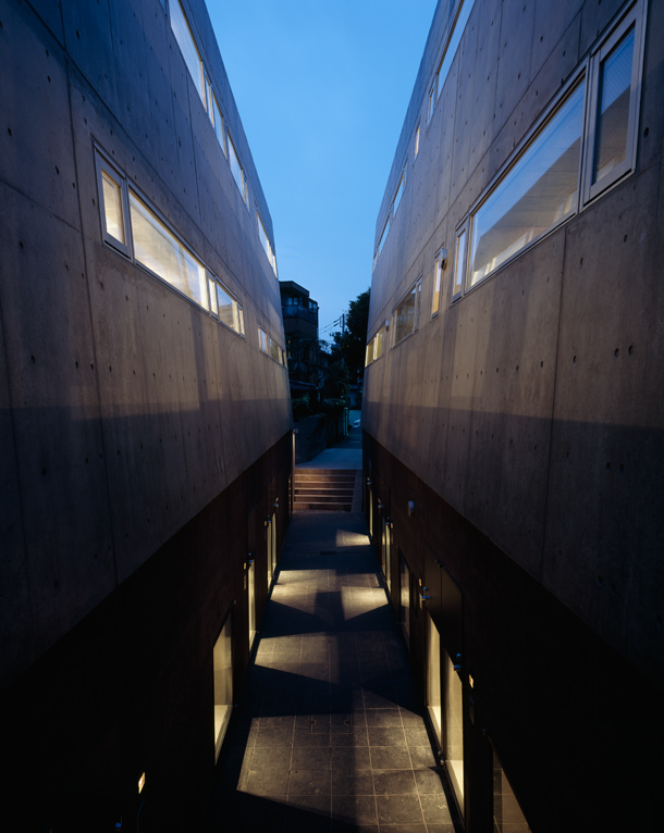 接続している路地を、敷地の中央にそのまま引き込み、両側にボリュームを分けて配置した。二つに分割された長屋は12の住戸に振り分けられ、その数だけかたちや広さをもっている。