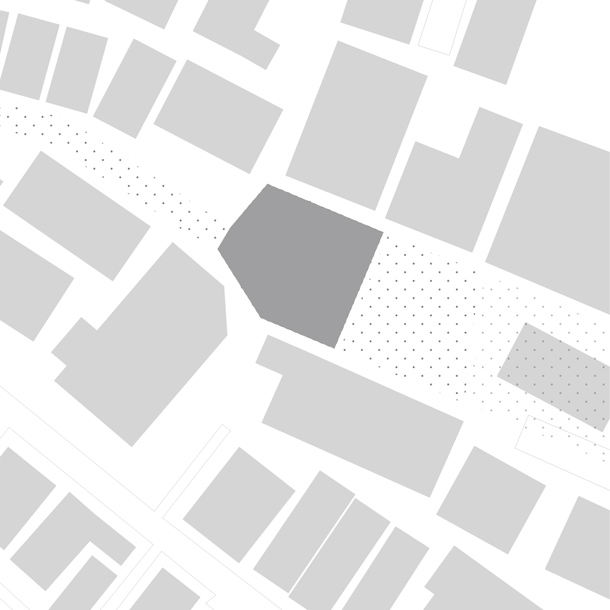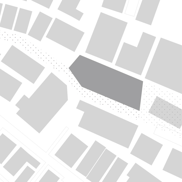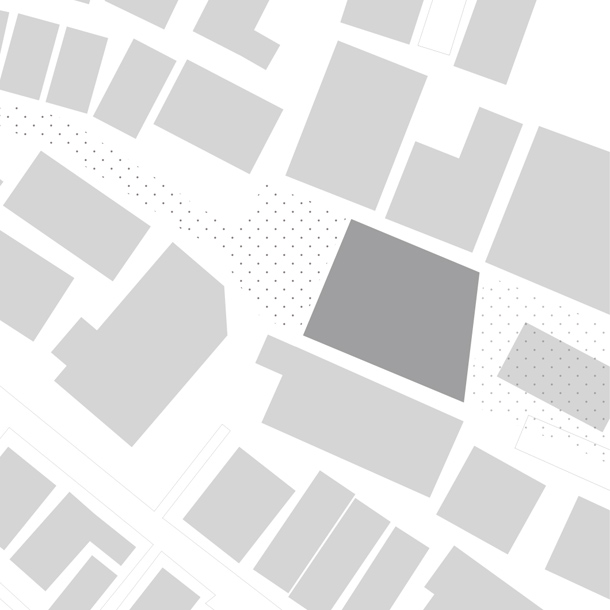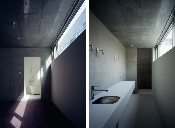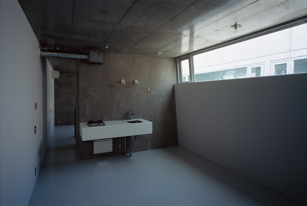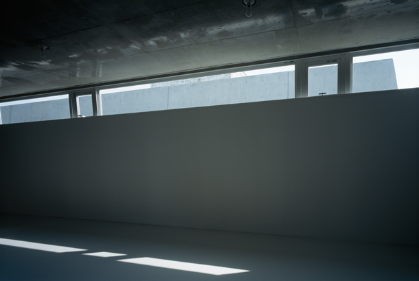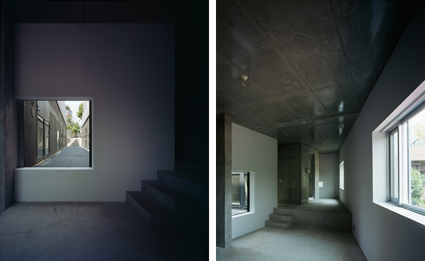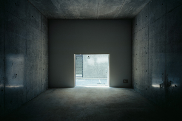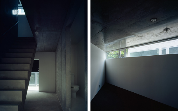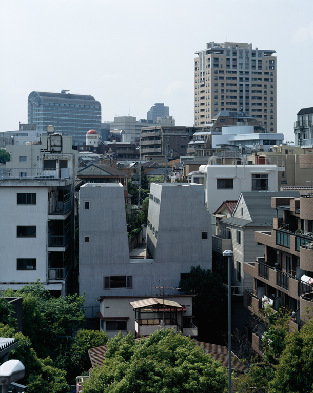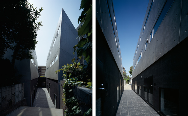 両側を戸建ての住宅にはさまれ、緩やかにカーブしながら傾斜する巾2.5mほどの路地をゆっくりと登っていくと、歩いてきた路地と同様のスケールをもちながら、少し堀込まれた空間が現れる。地面は1m程下がった位置にあり、どこからがこの建築の敷地なのかはっきりとは認識できず、そのまま階段を数段降りると地面に潜ったような感覚を覚える。周囲は建物に囲まれているが、空は遮るもの無く開放され、正面は5m程の段差があり開けている。またその先には首都高の高架が見える。