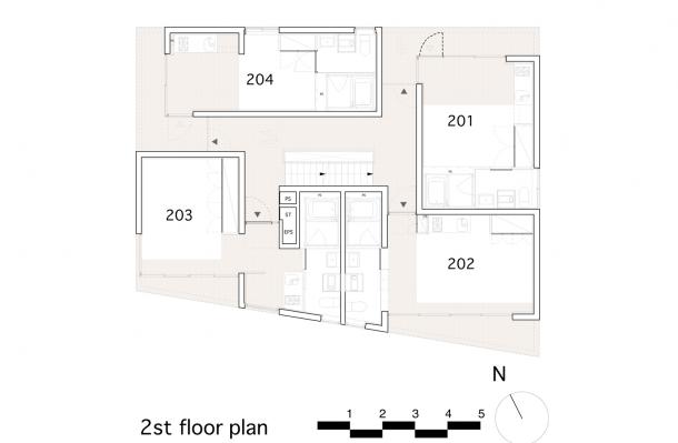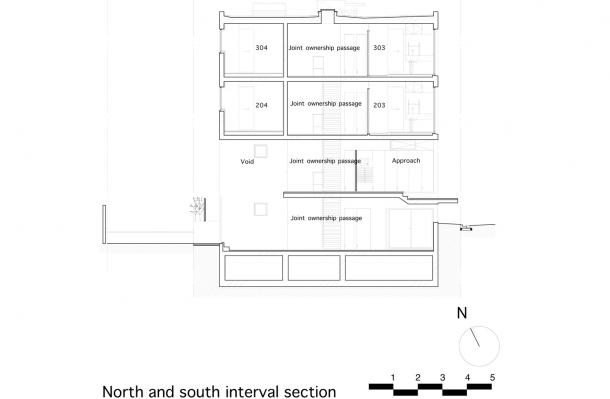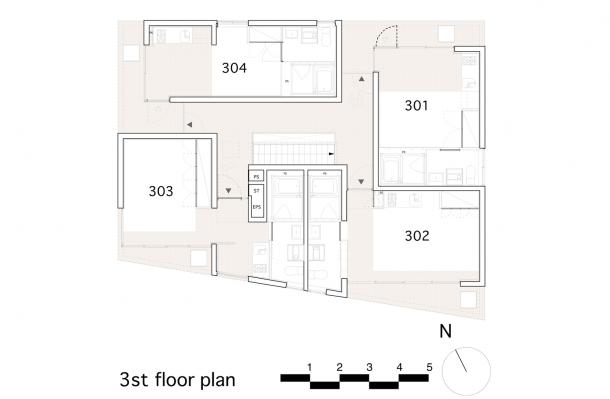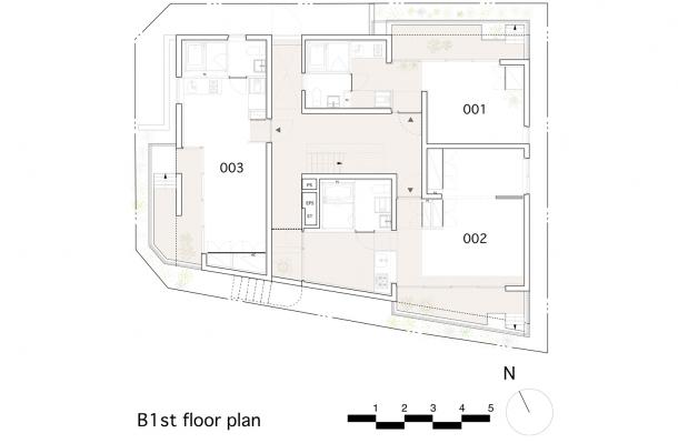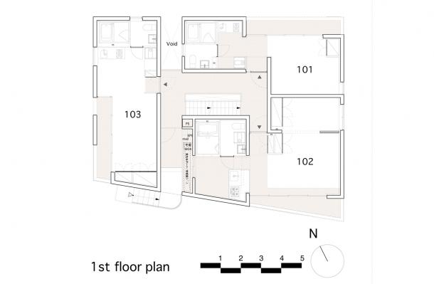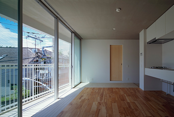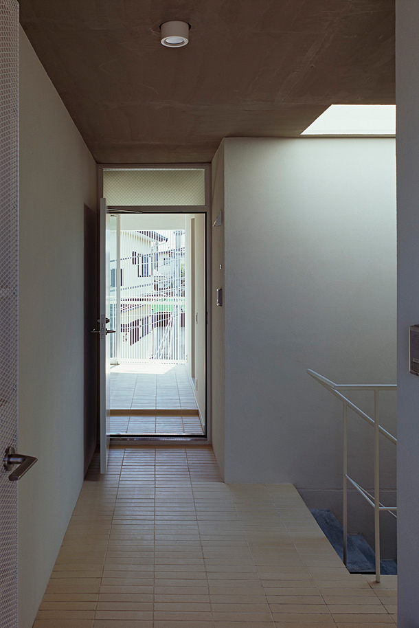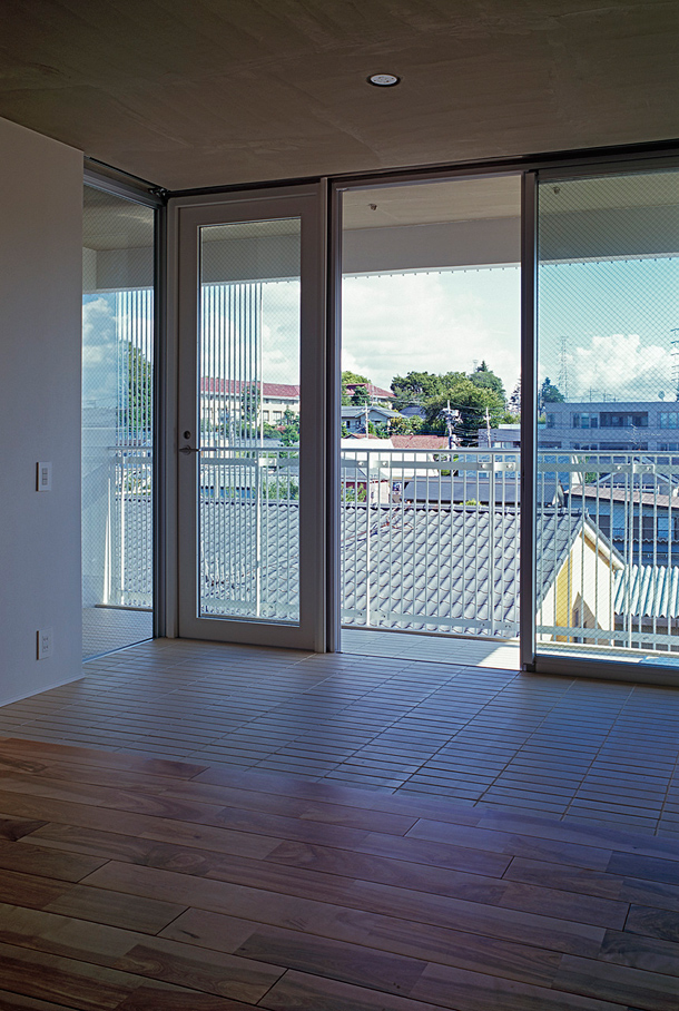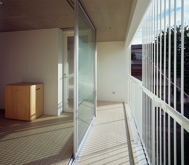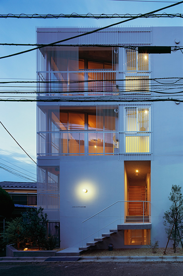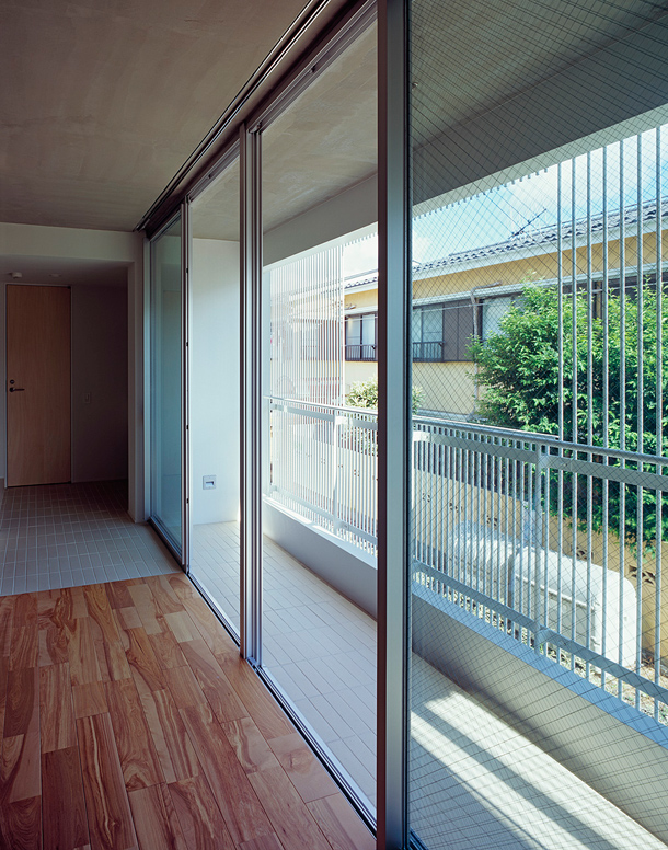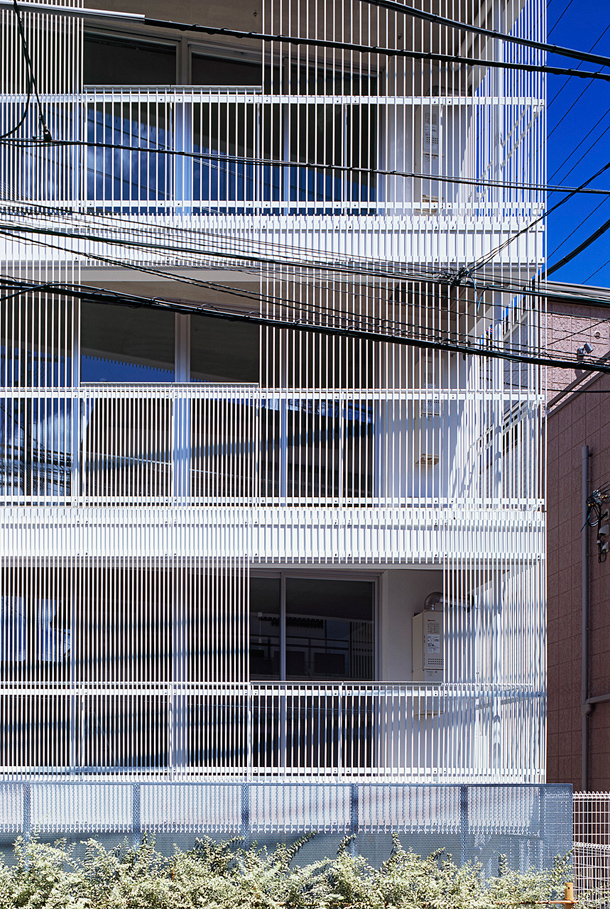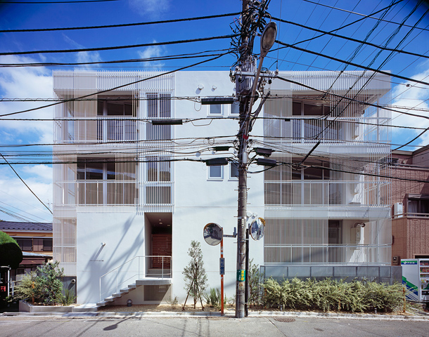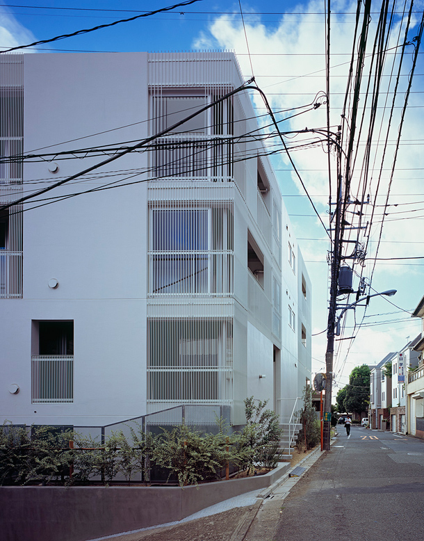 敷地は吉祥寺や渋谷へのアクセスも良い、利便性と落ち着いた住宅地の雰囲気が同居する井の頭線三鷹台駅にあります。周囲には住宅が建ち並んでいますが、3面が道路に接しているため近接した建物が無く、良好な距離感が保たれています。この場所のもつ周囲との距離感を大切にしながら、各住戸は角部屋になるように配置され、ゆったりとしたテラスを設えました。共用部の床仕上げは玄関を介して各住戸のテラスと繋がり、テラス・室内・共用部の関係が流動的になることで風の通り道が生まれ、テラスや共用部が生活に取り込まれた豊かな日常を演出してくれるはずです。建物外壁面の仕上げは白をベースとした明るく柔らかな色味で、同色の細い縦のルーバーが、テラスの周囲に緩やかな境界面をつくりだします。ルーバーは外部との視覚的関係を調整するため、その間隔を変化させながら配置され、外観はパッチワークのように外壁面と連続し、まるで羽衣を纏ったような軽やかな佇まいです。柔らかい日差しが木漏れ日のようにテラスに差し込み、心地よい開放感が生まれることでしょう。