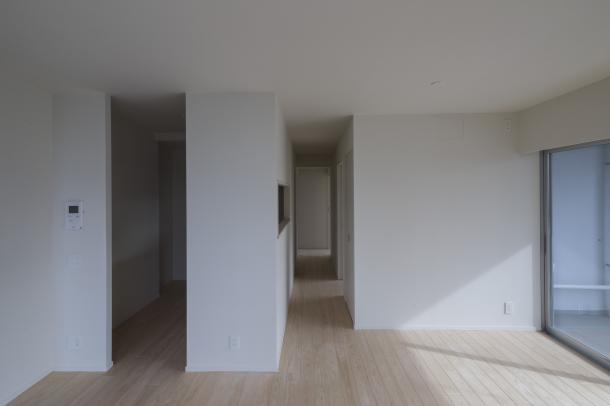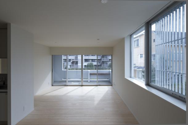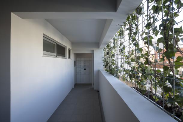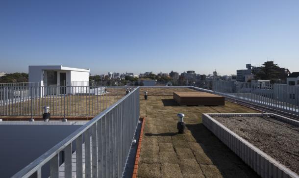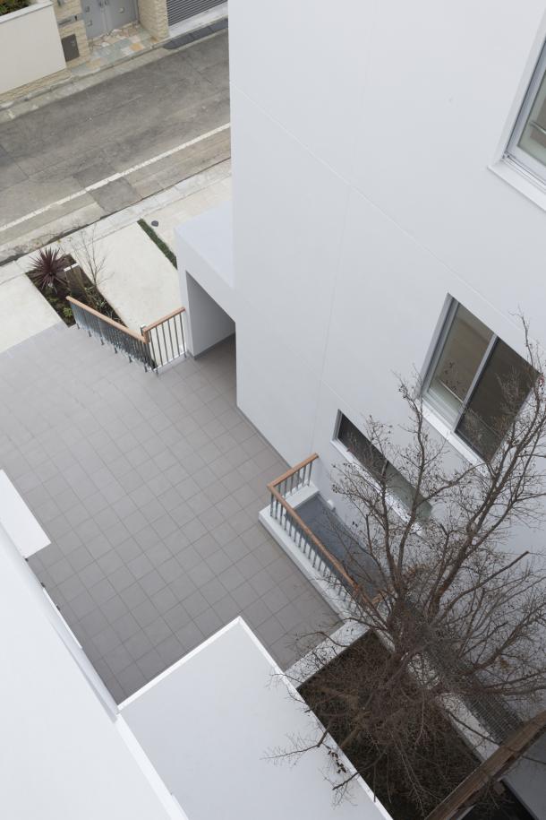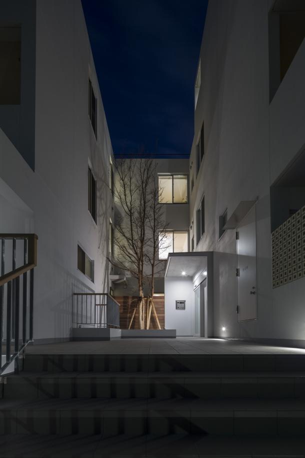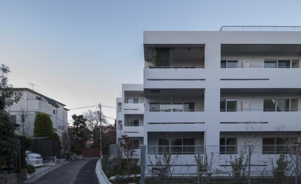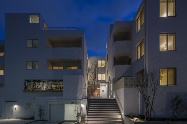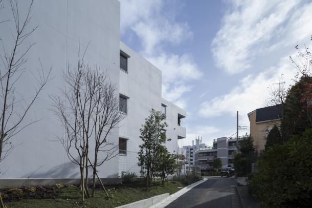 大田区南千束で計画を進めていた分譲集合住宅「洗足池エコヴィレッジ」が竣工しました。敷地の背後には洗足池が控え、南北には高低差があります。風の通り、素材感を生かすため、建物をずらしながら配置し、外形を雁行させることで住戸それぞれが2面もしくは3面が外気に面するように計画しています。中央のシンボルツリーは、暖かさと木の香りを漂わせ住民を出迎えてくれます。