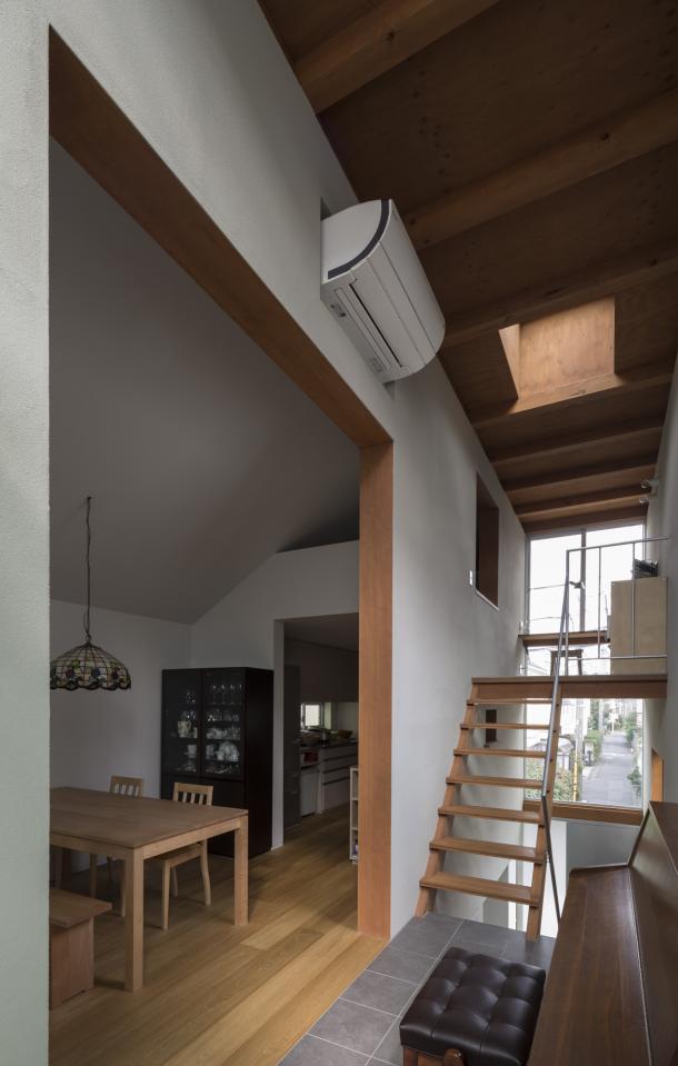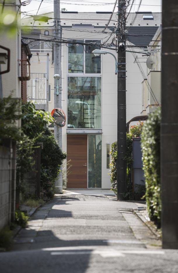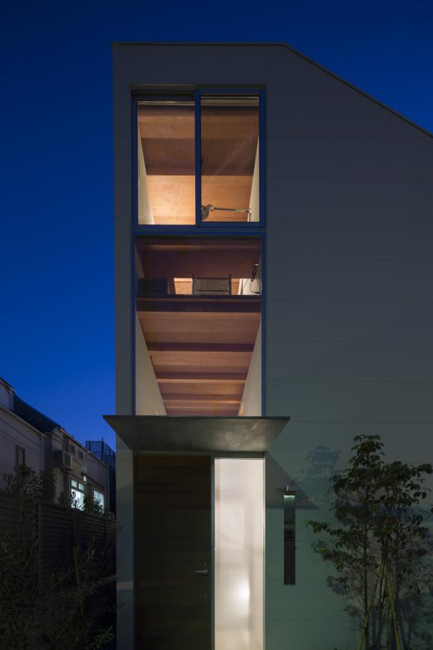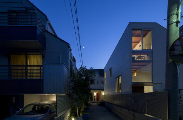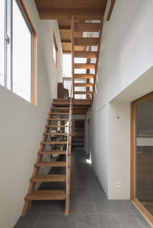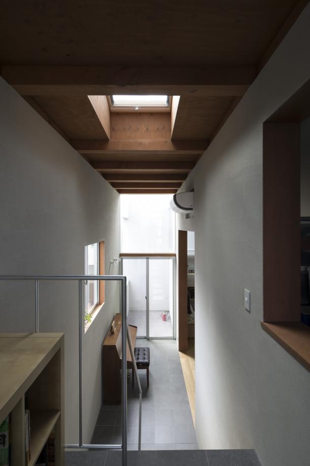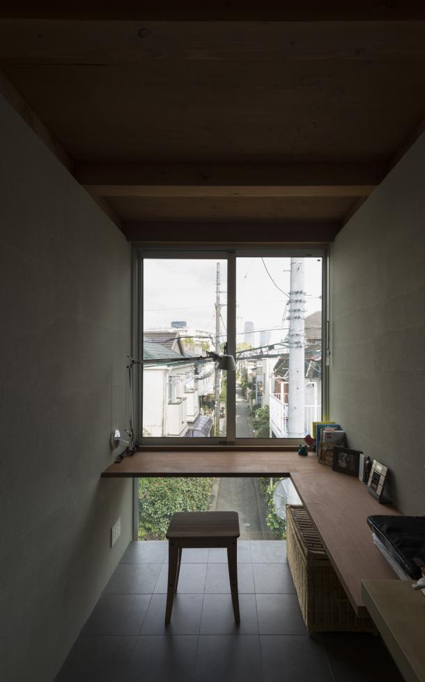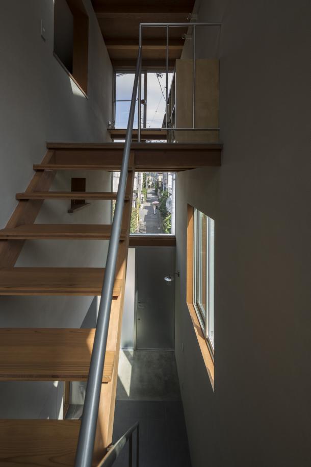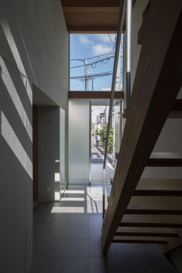 ホールは日常生活を彩る様々な行為を受け止め、移動空間と重ね合わされることで、街に接続された立体路地のようになった。寝室から繋がる縁側のようであり、子どもたちが動き回る明るいテラスでもあり、洗濯物を干す場所や街を見通す展望台にもなるような、暮らしと街が重なる場所である。