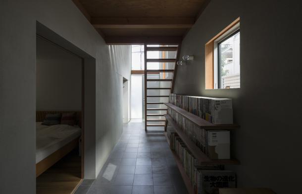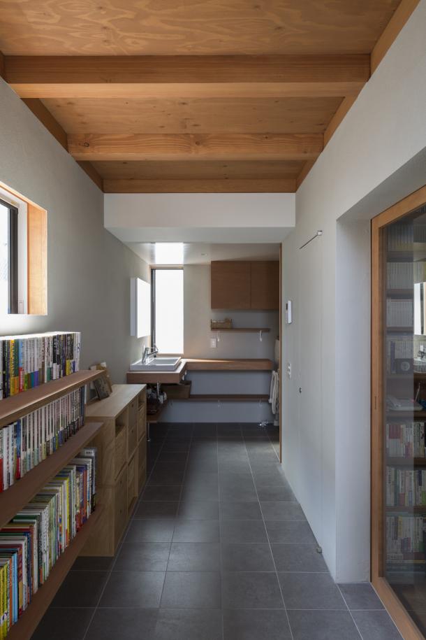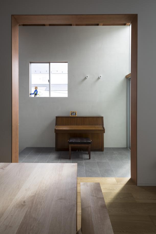 書斎やピアノ、図書コーナー、洗面、テラスまでも組み込まれ、壁は質感のある外部用左官材、床にはタイルを用いて、室内でありながらより路地に近い関係となるよう仕上げを選択している。