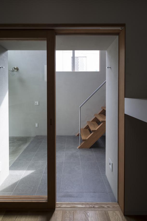居住スペース側の壁は意図的に厚くし、出入口というよりは大きな開口部を設けて外壁と同等な境界面として意識させることで、ホールが少しだけ特別な場所になるよう留意した。