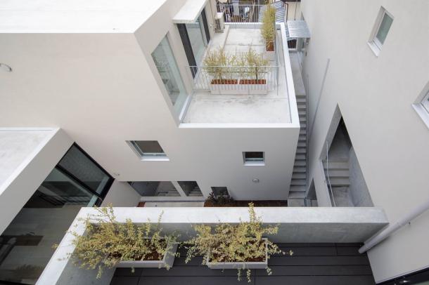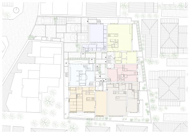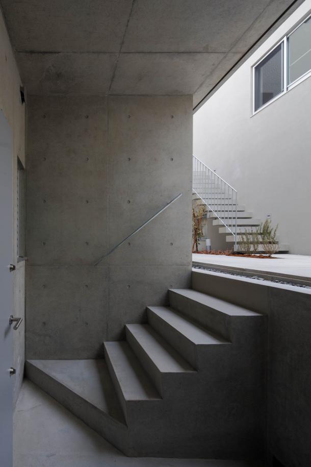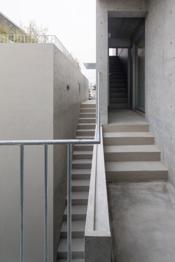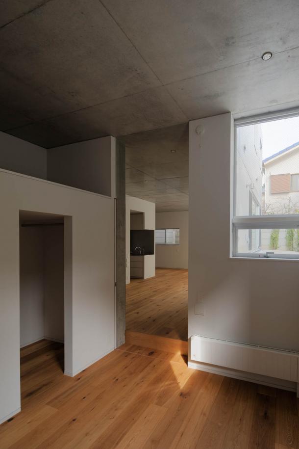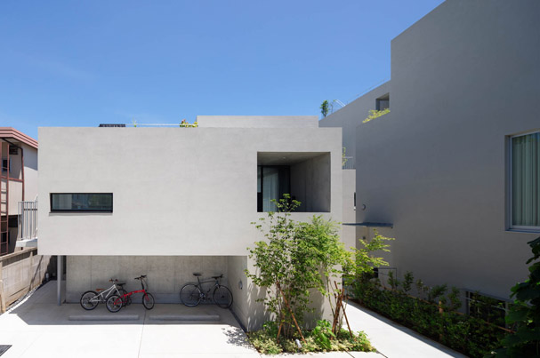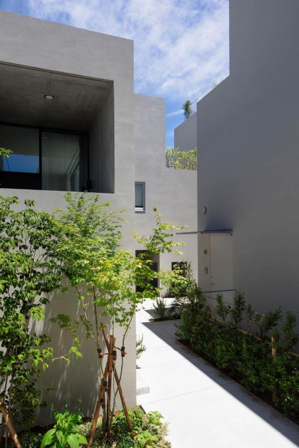 共用通路はどの住戸にも平等に接続しているが、通路に直接面した住戸入口は 1住戸のみで、凹ませたポーチや、ボリュームを切欠いた通路、レベル差や階段といった専有でもなく共用でもない中間領域を介して接続されている。また住戸へのアプローチを意図的に分散することで、共用通路はどの住戸にも異なる属性を持つことができ、住民は共用通路をそれぞれ自身の専有部が拡張された領域として認識することができる。 また、住戸の開口は、共用通路が視覚的にも専有部の延長として感じられるよう、他住戸との直接的な干渉を避けながら、住戸の開口の大きさや位置を決め、テラスや植栽計画を緩やかな緩衝帯と して全体を組み立てている。