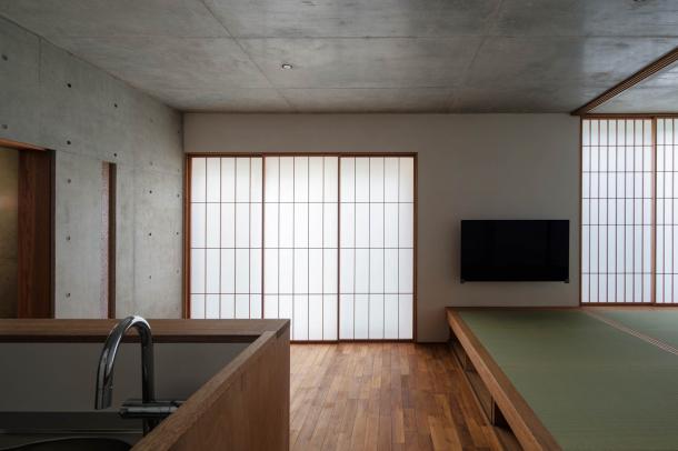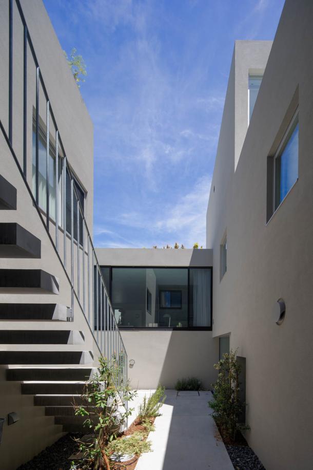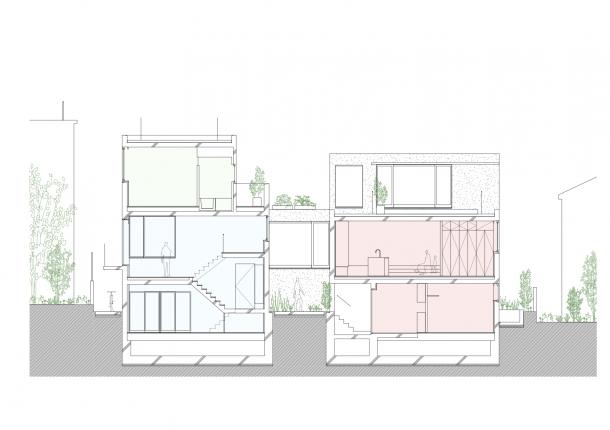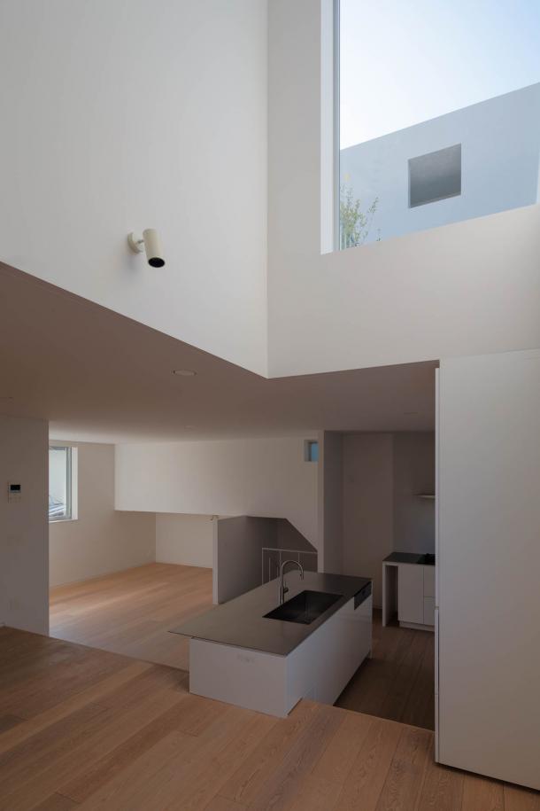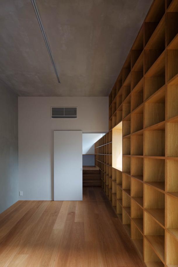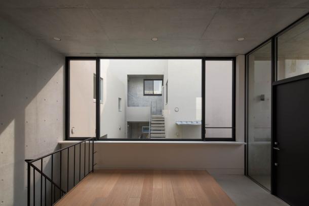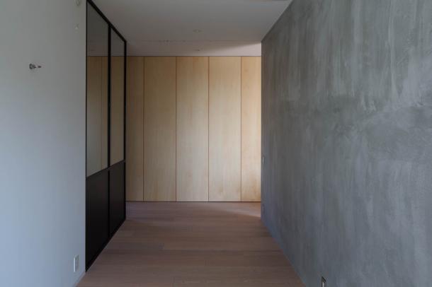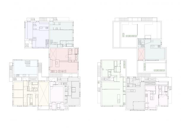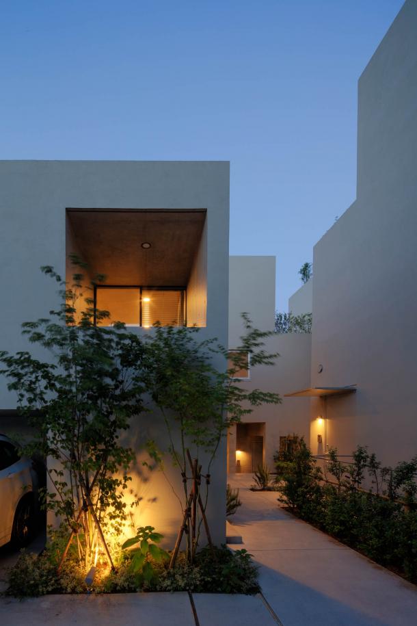 共用通路はどの住戸にも平等に接続しているが、通路に直接面した住戸入口は 1住戸のみで、凹ませたポーチや、ボリュームを切欠いた通路、レベル差や階段といった専有でもなく共用でもない中間領域を介して接続されている。また住戸へのアプローチを意図的に分散することで、共用通路はどの住戸にも異なる属性を持つことができ、住民は共用通路をそれぞれ自身の専有部が拡張された領域として認識することができる。 また、住戸の開口は、共用通路が視覚的にも専有部の延長として感じられるよう、他住戸との直接的な干渉を避けながら、住戸の開口の大きさや位置を決め、テラスや植栽計画を緩やかな緩衝帯と して全体を組み立てている。