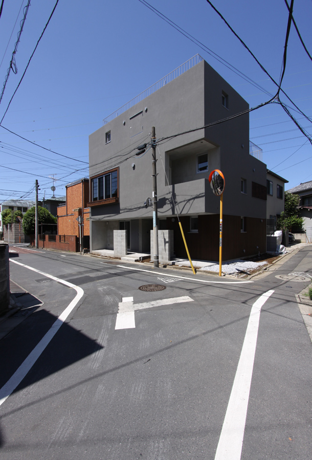 周辺が立て込んだ住宅地に建つ3階建ての二世帯住宅。道路斜線と北側斜線の稜線に納まる、凸凹...