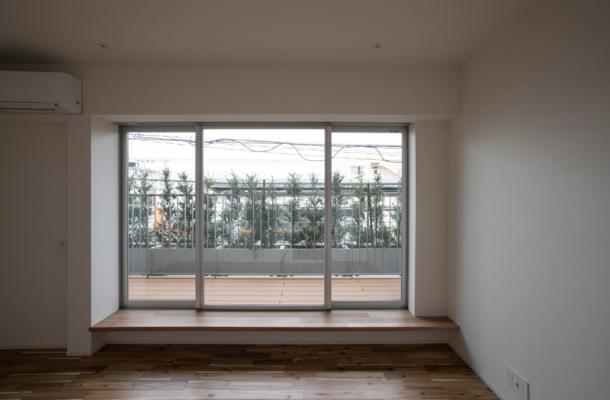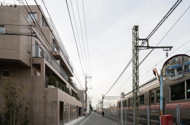 建物配置と「新たな窓辺」 下北沢の住宅地に建つ15戸の集合住宅。南側は土地のレベルが下...