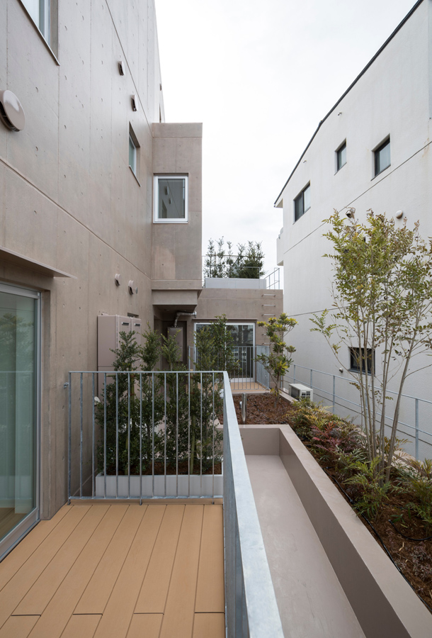 世田谷区の緑道に面する6世帯のコーポラティブハウス。緑道は、生活通路であり、公園のようで...