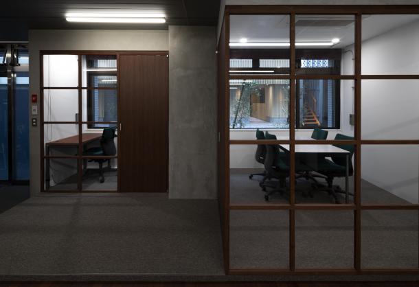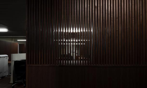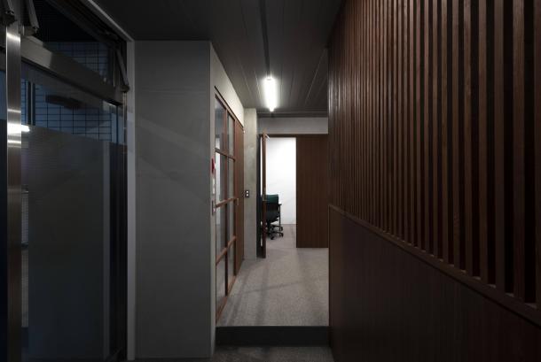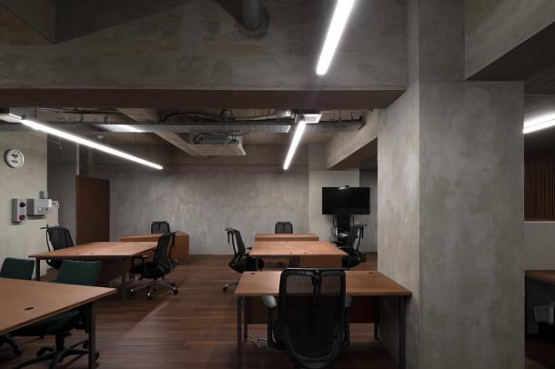 既存オフィスでも採用されていた赤みのある木目仕上げを会社のアイデンテティとして捉え、床材の天然木デッキ材から間仕切りルーバー、格子窓、収納扉、デスク天板まで同じ色調で統一し、空間の一体性を高めている。その他仕上げは既存コンクリート躯体の現しやモルタル仕上げによって木目を際立たせ、空間に広がりを与えた。また床下各所にコンセントボックスを埋め込む事でデスクのレイアウトを自由にし、ライン照明によって執務空間に均一な照度を確保している。 この記事にコメントする