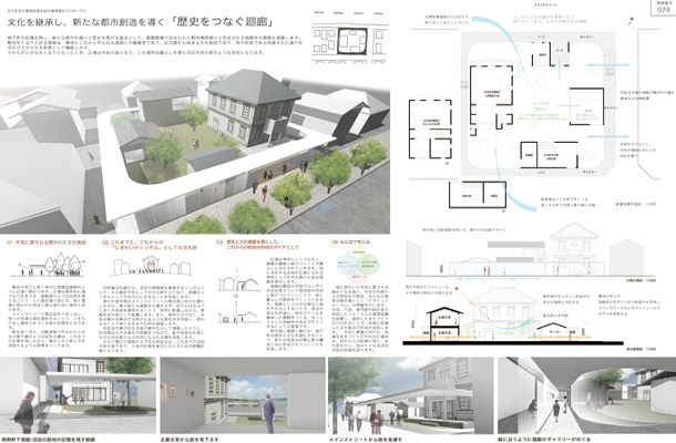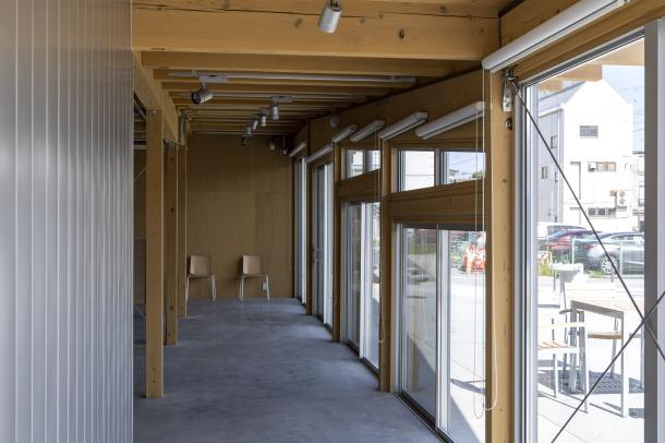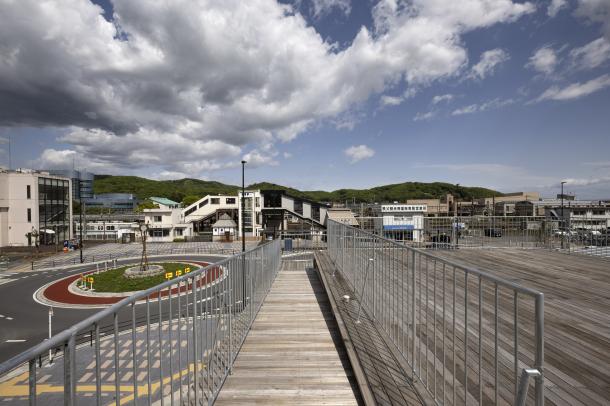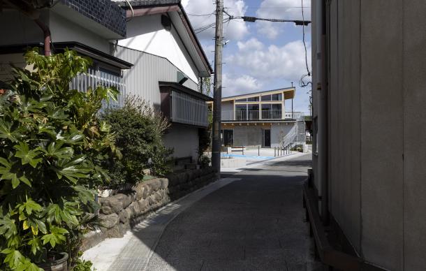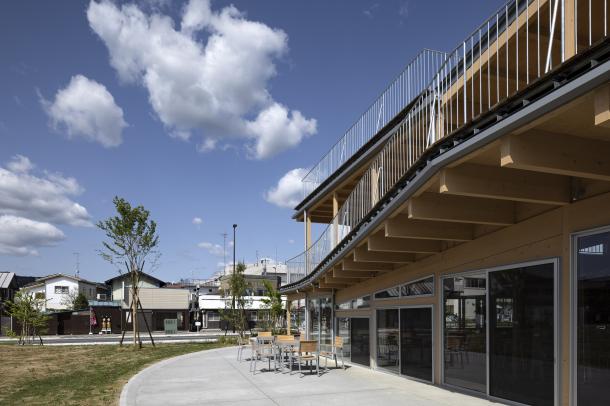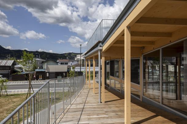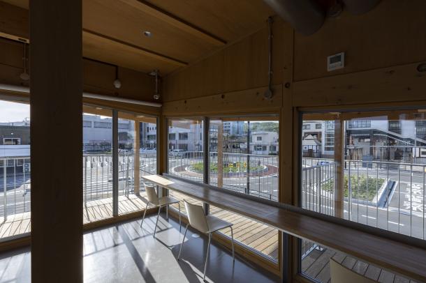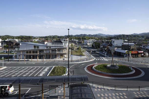 寄居駅南口の中心市街地は、商店街を通る本通り線から寄居駅への進入路が一方通行で狭く、拡幅のために様々 な事業が検討されたが実施には至らなかった。一方で市街地は賑わいが失われており、道路だけではなく賑わい の創出が大きな課題となっていたこともあり、町は中心市街地活性化基本計画を策定し、全国の町では初めて国 の認可を得て、中心市街地活性化事業に取り組んでいた。計画に際して、私たちは寄居町の街並みとその先に続 く自然豊かな荒川沿いの並木、関東山地の山々、この風景の重なりが寄居町の印象を特徴付けていると考えた。 施設を利用する人々の賑やかな活動をサポートするための場所をつくり、人々の交流が新たな風景の要素として 加わることで元気で活気のある新しい寄居町の経験を創出できると考えている。