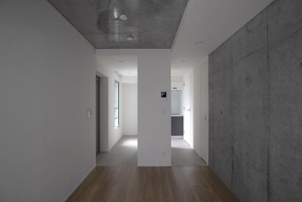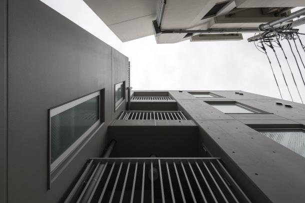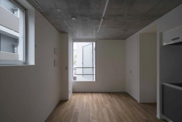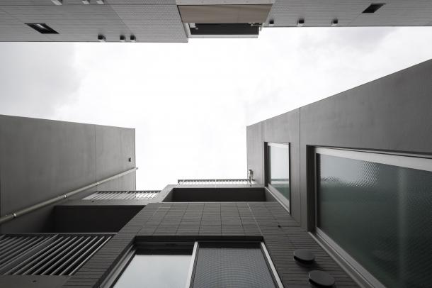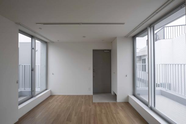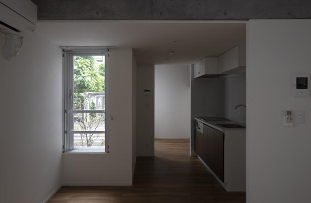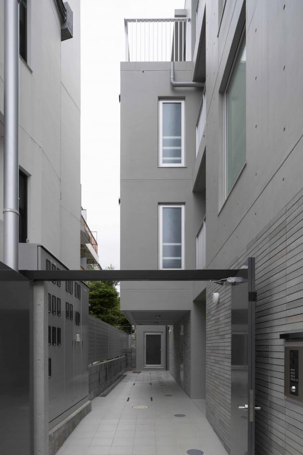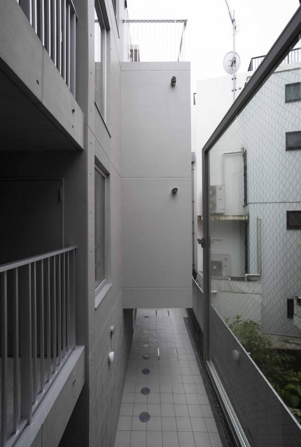周囲は建物が隣接していたため、それぞれの住戸と外部の環境をいかにして関係づけるかが、計画の課題となった。廊下を設けず階段室を2箇所つくり、共用部を介して東西に住戸単位で凹凸をつけるようにズラして建物を構成している。また廊下を作らず敷地外への避難経路を東西に設けることで、居室が角部屋となり敷地内に干渉空間ができるため、変遷する周辺街区の変化に左右されず、視線のヌケや十分な採光と換気を行える状況をつくることができた。