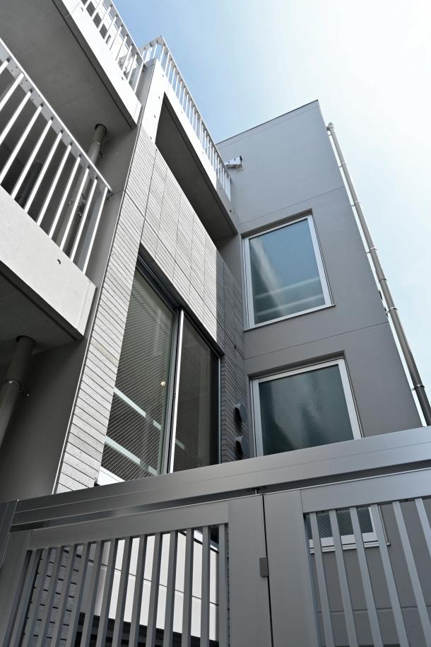 新宿区に建つ6世帯のコーポラティブハウス。接続している道路からアプローチの階段を下りると...