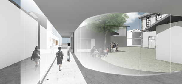 用途の可変を想定した小規模複合施設(初期は賃貸+ホテル+カフェ+スタジオ)。外部と繋が...